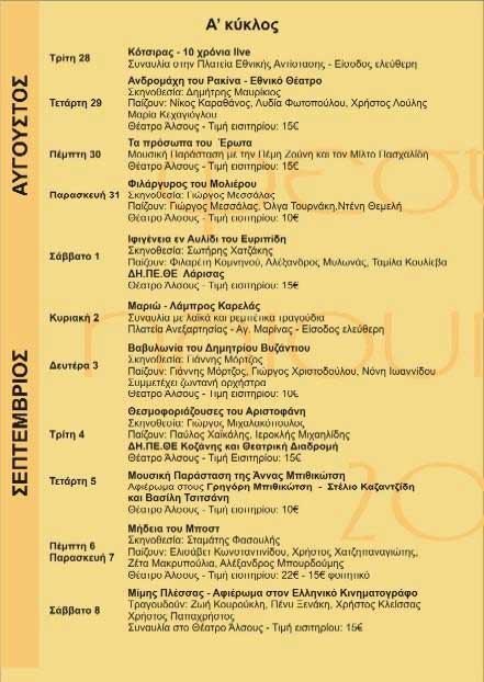 Κότσιρας, Φαραντούρη, Πλέσσας, Κοργιαλάς -Ευρυδίκη, Φωτεινή Σαββατιανού από το χώρο της μουσικής, και τα σημαντικότερα ονόματα από τον χώρο του θεάτρου θα εμφανιστούν στο Θέατρο ¶λσους στον πρώτο κύκλο του Φεστιβάλ που θα ξεκινήσει στις 28 Αυγούστου και θα κλείσει στις 21 Σεπτεμβρίου.