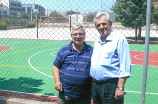 Λεζάντα: Ο Αντιδήμαρχος Διοίκησης και Κοινωνικών Υπηρεσιών, Χαράλαμπος Κολιοφώτης και ο πρόεδρος της σχολικής επιτροπής του 5ου Γυμνασίου, Μαρίνος Κόκλας, μπροστά από το νέο γήπεδο
