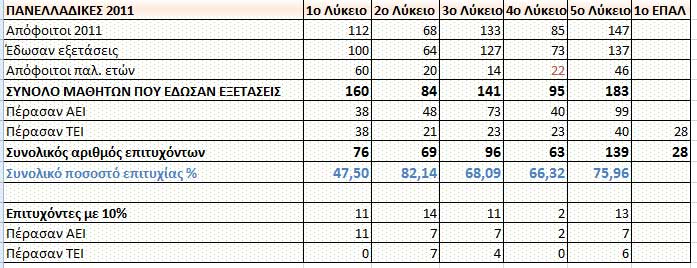 Τα ποσοστά επιτυχίας των Λυκείων της Πόλης στις Πανελλαδικές 2011