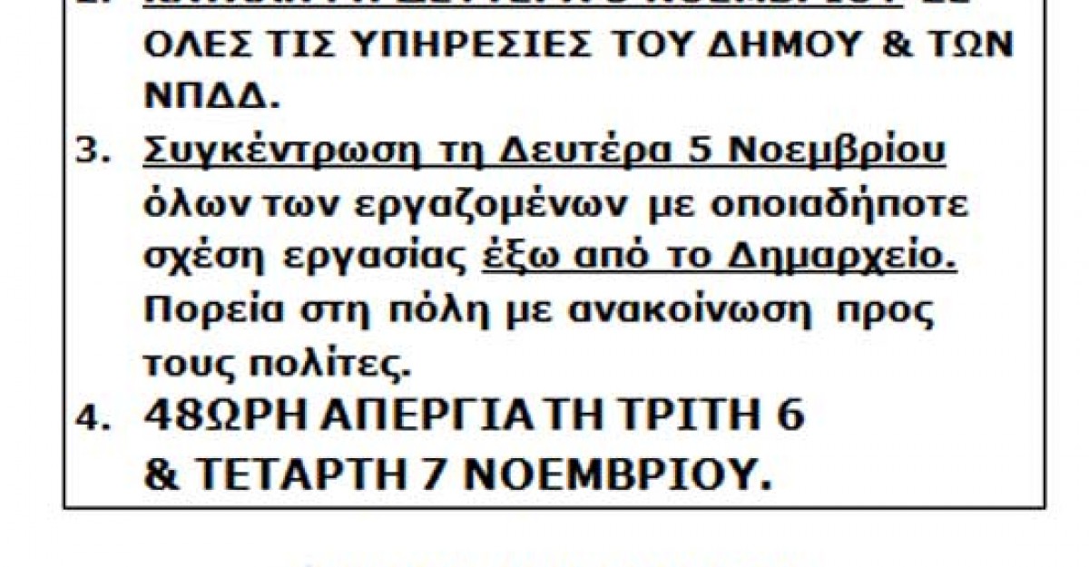 Σε κατάληψη του Δημαρχείου, των κτιρίων και εγκαταστάσεων του Δήμου προχωρούν τη Δευτέρα οι εργαζόμενοι του Δήμου, ενώ την Τρίτη και Τετάρτη οι Δημοτικές Υπηρεσίες θα παραμείνουν κλειστές λόγω συμμετοχής των εργαζομένων στις απεργιακές κινητοποιήσεις της ΑΔΕΔΥ.
