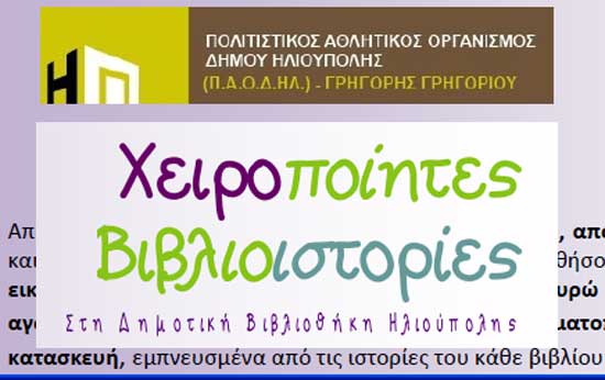 Την Πέμπτη 29 Νοεμβρίου 2012, το Πολιτιστικό Κέντρο του Δήμου Ηλιούπολης εγκαινιάζει στο χώρο της Δημοτικής Βιβλιοθήκης το πρόγραμμα «Χειροποίητες Βιβλιοϊστορίες».