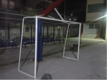 - Πέστε μας κύριοι της Δημοτικής αρχής ποιος είχε την φαεινή ιδέα στον προαύλιο χώρο του 4ου Γυμνασίου να τοποθετήσει και να οξυγονοκολλήσει τέρματα 5Χ5 πάνω στις ήδη υπάρχουσες μπασκέτες. Δεν είναι επικίνδυνο αυτό για κάποιο παιδί με το νεανικό παρορμητισμό, να πέσει πάνω στα σίδερα; Αντί να καλύψετε την μπασκέτα με κάποιο προστατευτικό υλικό αντίθετα προσθέσατε σιδερένια κατασκευή τερμάτων. Ο υπεύθυνος ας μας δώσει μια απάντηση σε ποιο κανονισμό προβλέπεται τέτοια κατασκευή.