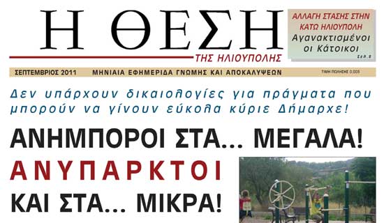 Κυκλοφόρησε το τεύχος Σεπτεμβρίου της εφημερίδας Η ΘΕΣΗ ΤΗΣ ΗΛΙΟΥΠΟΛΗΣ. Η εφημερίδα κυκλοφορεί με κεντρικό τίτλο στο πρωτοσέλιδο της "Ανύμποροι στα... μεγάλα! Ανύπαρκτοι και στα... μικρά!", αναφερόμενη στα πεπραγμένα της Δημοτικής Αρχής.