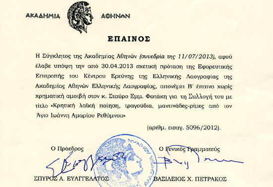 Τρείς επαίνους απένειμε φέτος η Ακαδημία Αθηνών στο συμπολίτη μας Σταύρο Φωτάκη για το λαογραφικό του έργο σχετικά με τα αμαριώτικα χωριά Ρεθύμνου Κρήτης.