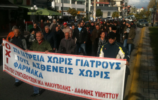 Συγκέντρωση στα Κανάρια και πορεία στον ΕΟΠΥΥ Ηλιούπολης πραγματοποίησε την Τετάρτη 18/12/2013 η Λαική Επιτροπή Ηλιούπολης διαμαρτυρόμενη για τα σχέδια της κυβέρνησης στον τομέα της Υγείας.
