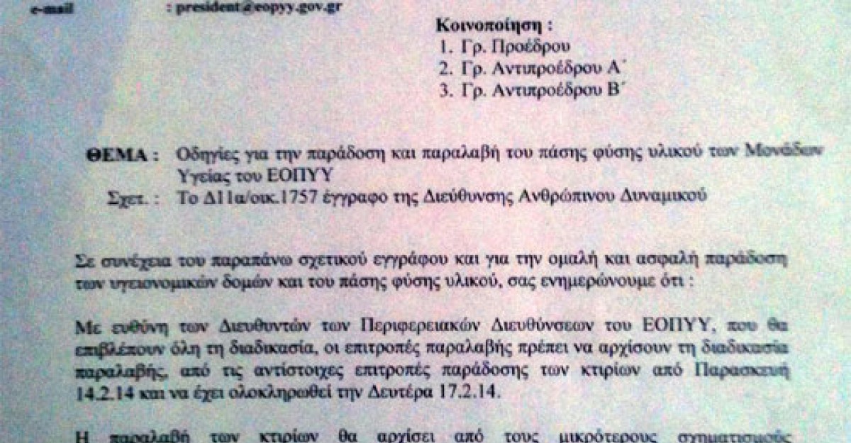 Με έγγραφο που στάλθηκε στις 13/2 σε όλες τις μονάδες Υγείας τoυ ΕΟΠΥΥ σε όλη τη χώρα, δίνεται εντολή στους διευθυντές των μονάδων να παραδώσουν τα κλειδιά των κτηρίων στους αρμόδιους ελεγκτές μέχρι την Δευτέρα 17 Φεβρουαρίου. Κινητοποίηση και στον ΕΟΠΥΥ Ηλιούπολης.