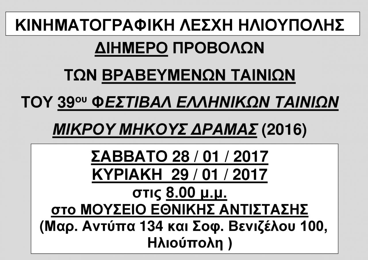 ΚΛΗ - ΤΟ ΦΕΣΤΙΒΑΛ ΔΡΑΜΑΣ ΤΑΞΙΔΕΥΕΙ ΣΤΗΝ ΗΛΙΟΥΠΟΛΗ - ΣΑΒΒΑΤΟ 28/1 ΚΑΙ ΚΥΡΙΑΚΗ 29/1/2017, 8:00 μ.μ., ΣΤΟ ΜΟΥΣΕΙΟ ΕΘΝΙΚΗΣ ΑΝΤΙΣΤΑΣΗΣ
